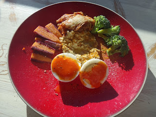 some purple haze carrots, kimchi, broccoli, hummus and hard boiled eggs (jambaloney puts our home-made hot sauce on his eggs - not me. no way!)
