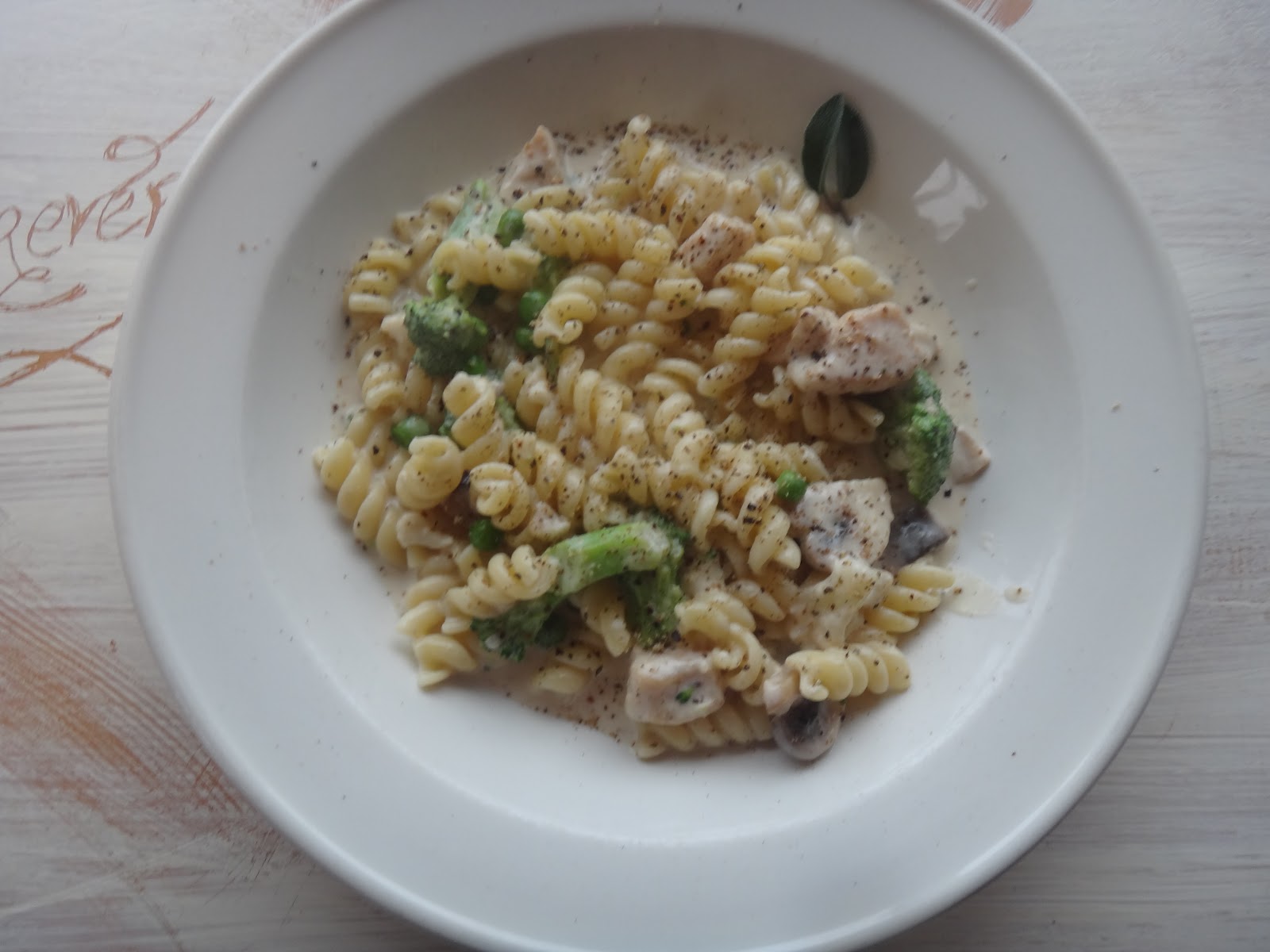 and here's some kymberz chicken alfredo with mushroons, broccoli and cauliflower.